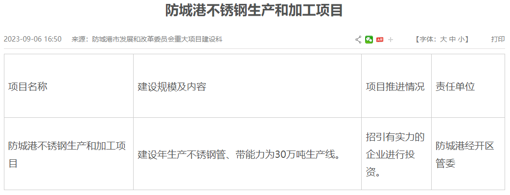 廣西防城港不銹鋼生產(chǎn)和加工項目主要建設(shè)年生產(chǎn)不銹鋼管、帶能力為30萬噸生產(chǎn)線,目前項目處于招引有實力的企業(yè)進行投資階段。