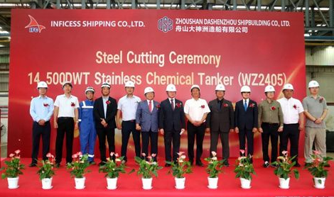 6月19日,舟山大神洲造船有限公司為Inficess Shipping CO., LTD.建造的14500DWT 不銹鋼化學(xué)品船(WZ2405)在盤(pán)峙廠區(qū)舉行開(kāi)工儀式。