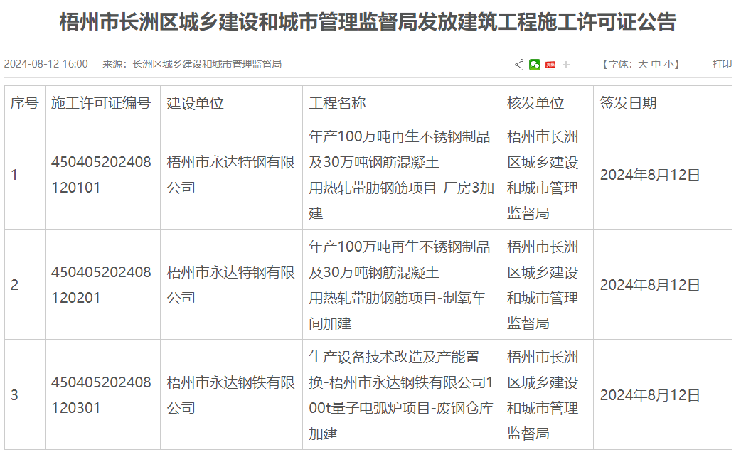 8月12日,梧州市永達特鋼有限公司年產(chǎn)100萬噸再生不銹鋼制品及30萬噸鋼筋混凝土用熱軋帶肋鋼筋項目廠房3加建、制氧車間加建以及100t量子電弧爐項目廢鋼倉庫加建均獲建筑工程施工許可證。