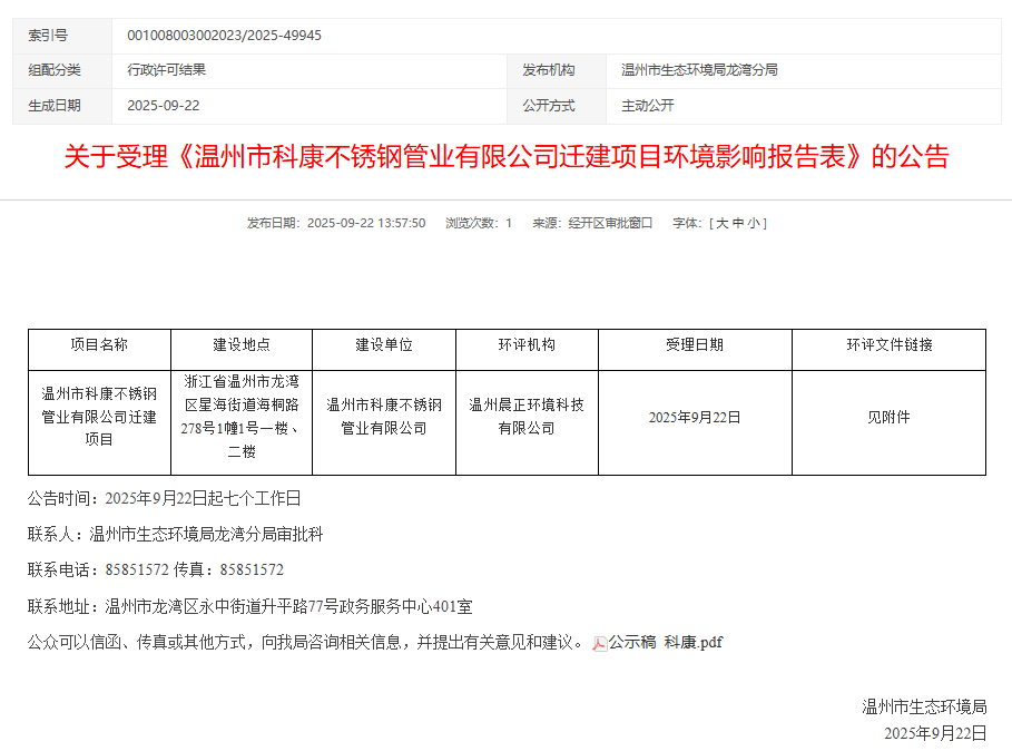 2025年9月22日,溫州市生態(tài)環(huán)境局受理溫州市科康不銹鋼管業(yè)有限公司遷建項(xiàng)目環(huán)境影響報(bào)告表并對(duì)外進(jìn)行公告,公告期:7個(gè)工作日。