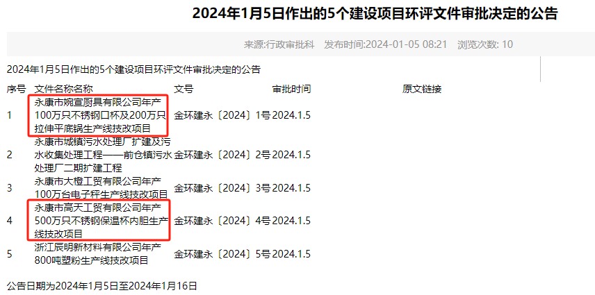 據(jù)顯示,涉及不銹鋼項目有2個,分別為:永康市婉宣廚具有限公司年產(chǎn)100萬只不銹鋼口杯及200萬只拉伸平底鍋生產(chǎn)線技改項目、永康市高天工貿(mào)有限公司年產(chǎn)500萬只不銹鋼保溫杯內(nèi)膽生產(chǎn)線技改項目。